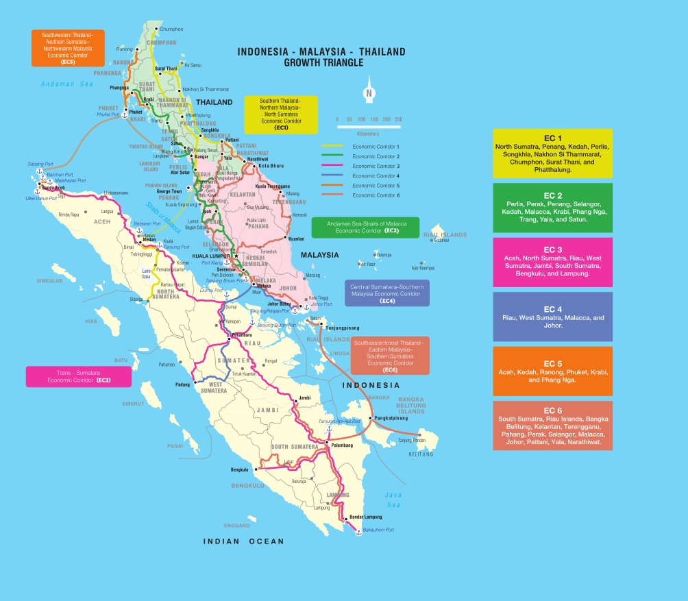 Economic Corridors (EC) in IMT-GT are strategic routes designed to enhance regional integration and economic development by improving connectivity and facilitating trade and investment. These corridors connect economic nodes, linking key growth centres, ports, SEZ and border crossings, creating a network that supports the movement of goods, services, and people across the subregion.